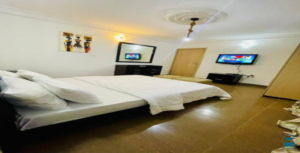offers a comfortable stay in Abuja. The apartment features two bedrooms and two bathrooms, ensuring ample space for guests.