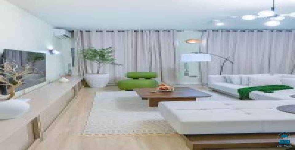 spacious apartment with three bedrooms and two bathrooms. The living room features a sofa bed and a dining area, providing ample space for relaxation and entertainment.