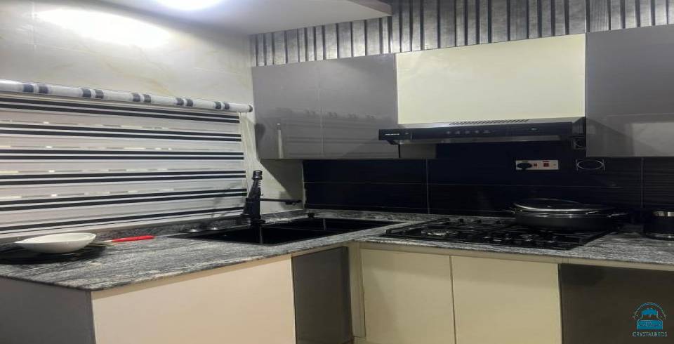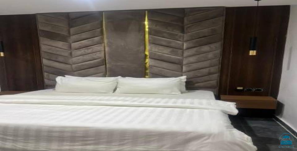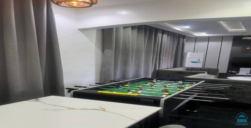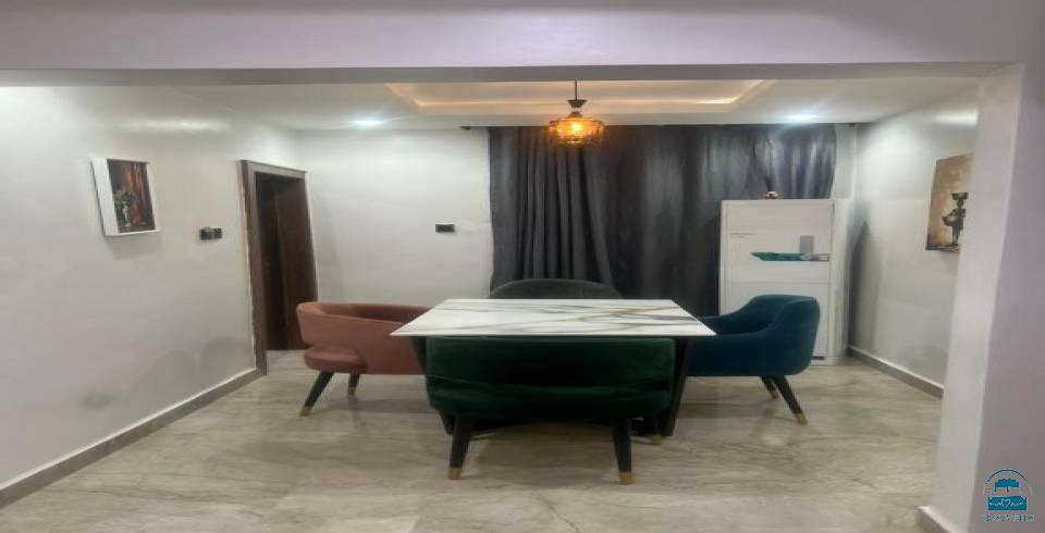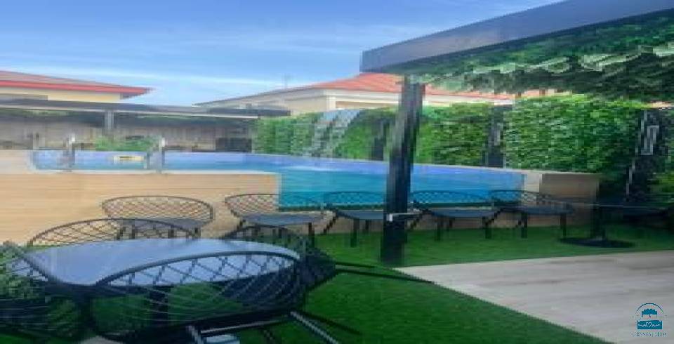 Koza Park Apartment in Benin City offers a two-bedroom, two-bathroom layout with a spacious living room. The apartment includes air-conditioning, a balcony, a fully equipped kitchen, a private pool, and a TV.