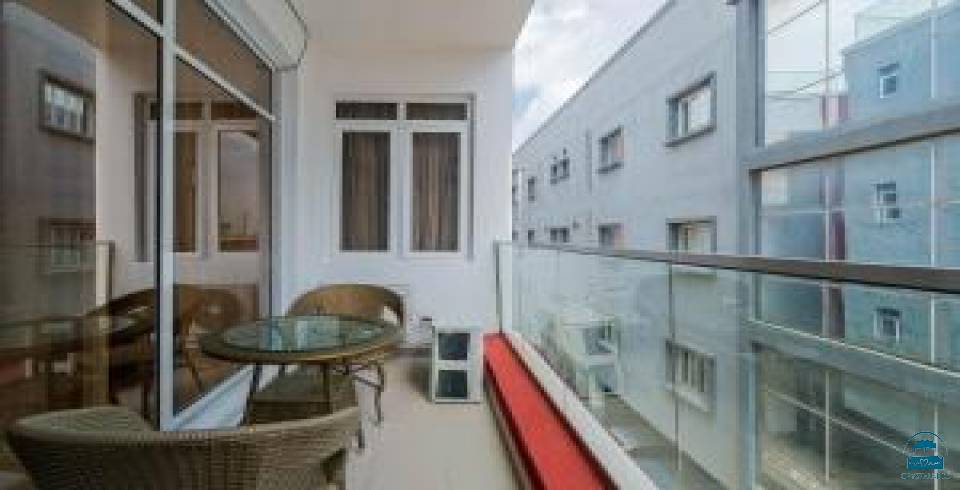 offers spacious apartments with three bedrooms and three bathrooms. Each unit features a living room, balcony, and fully equipped kitchen.